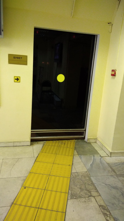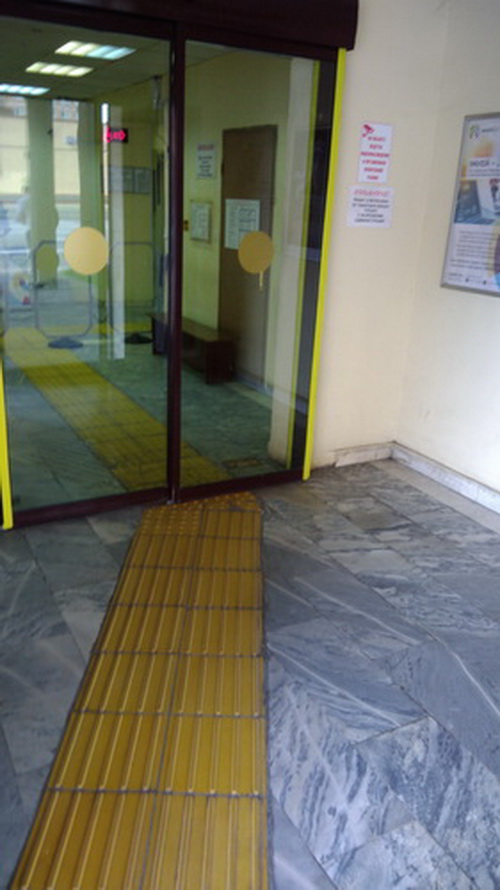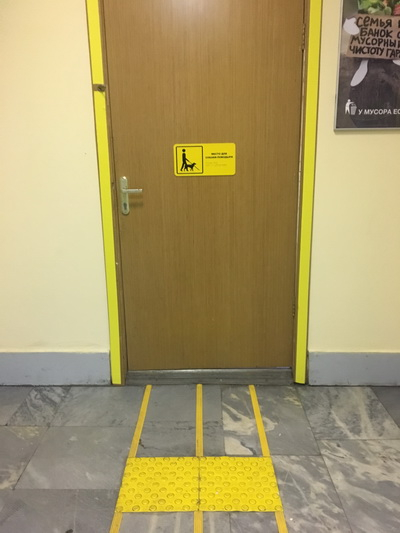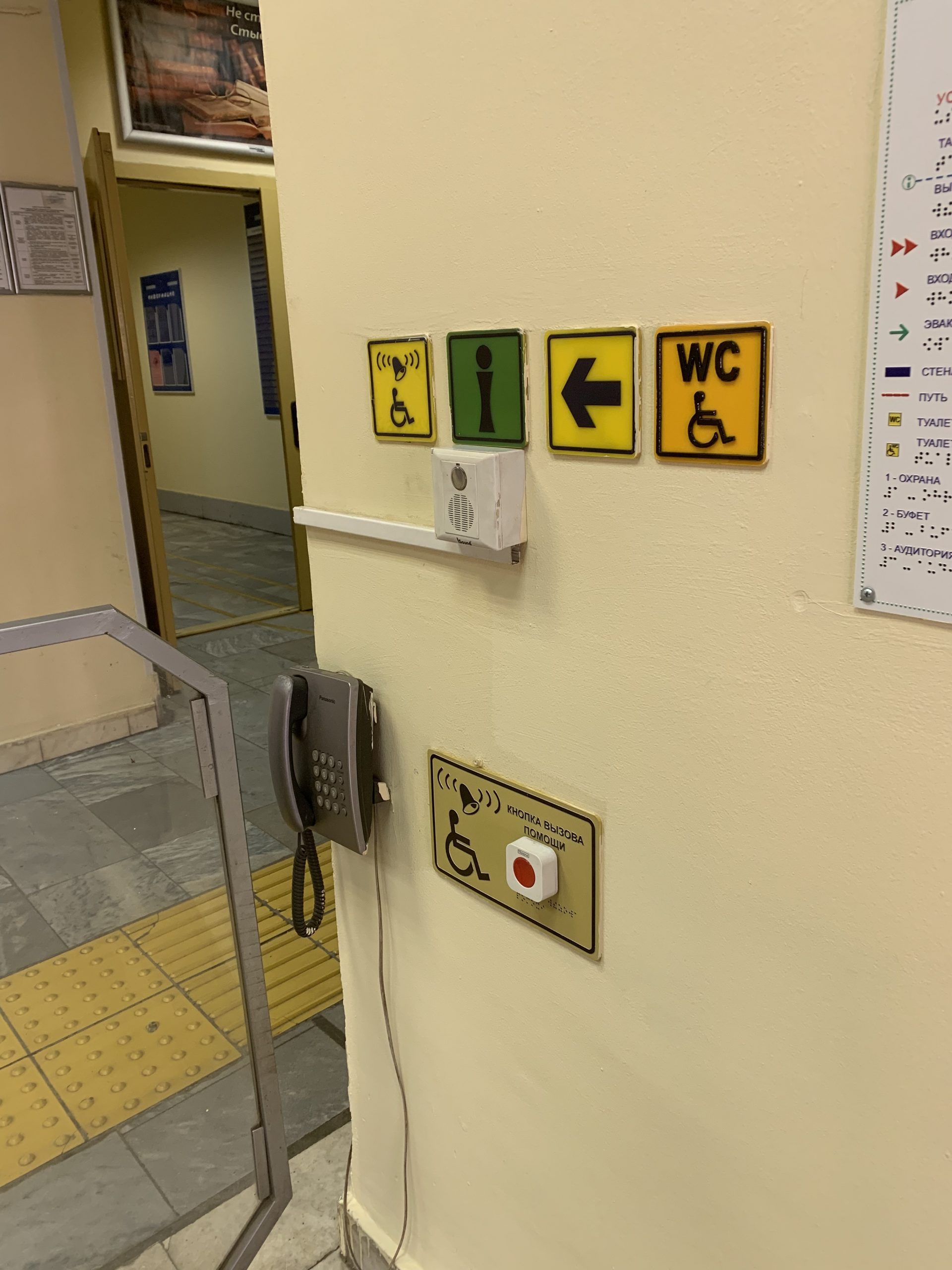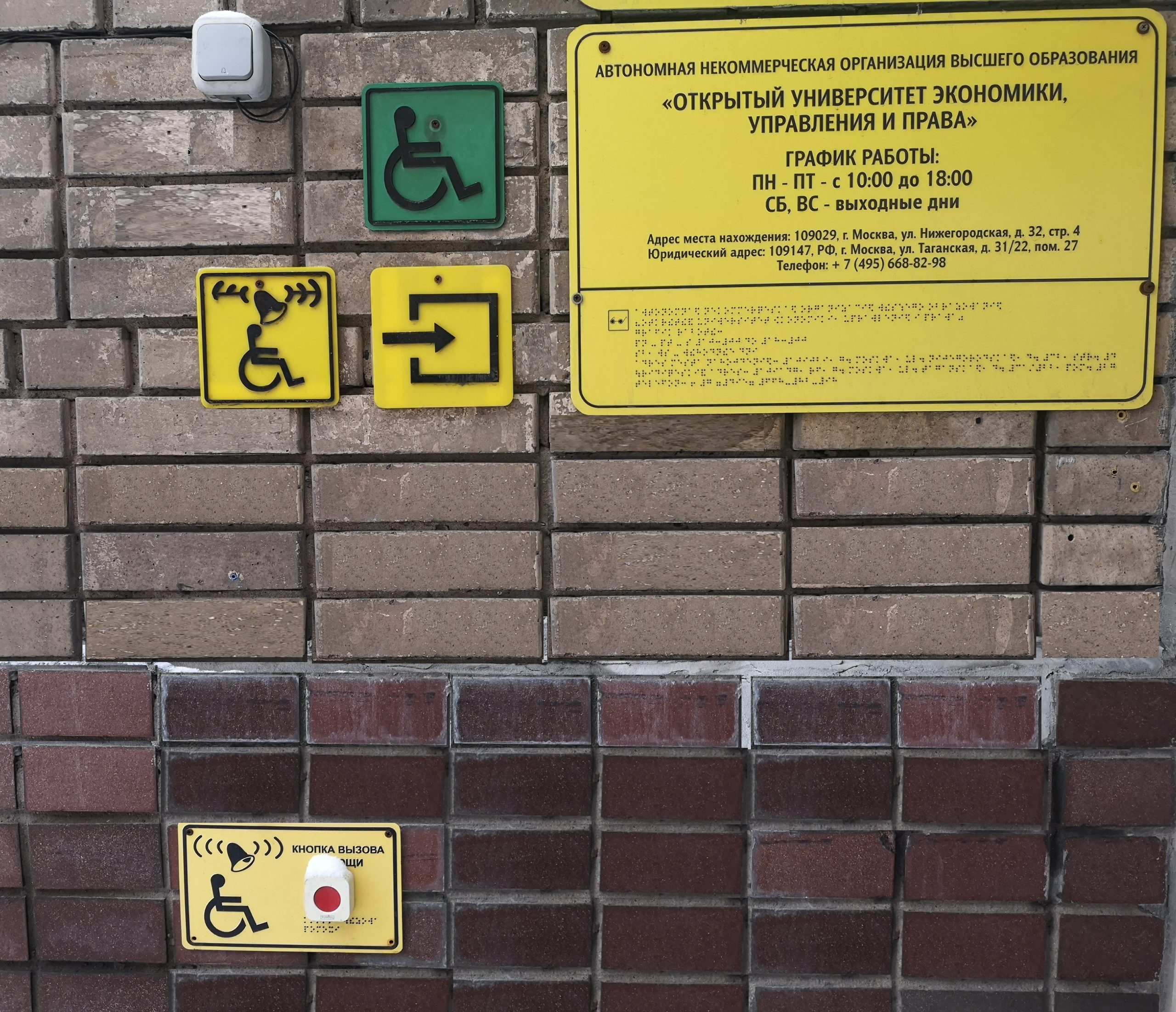 а) наличие при входе в объект вывески с названием организации, графиком работы, планом здания, выполненных рельефно-точечным шрифтом Брайля и на контрастном фоне, кнопка вызова персонала для сопровождения лиц с ограниченными возможностями;